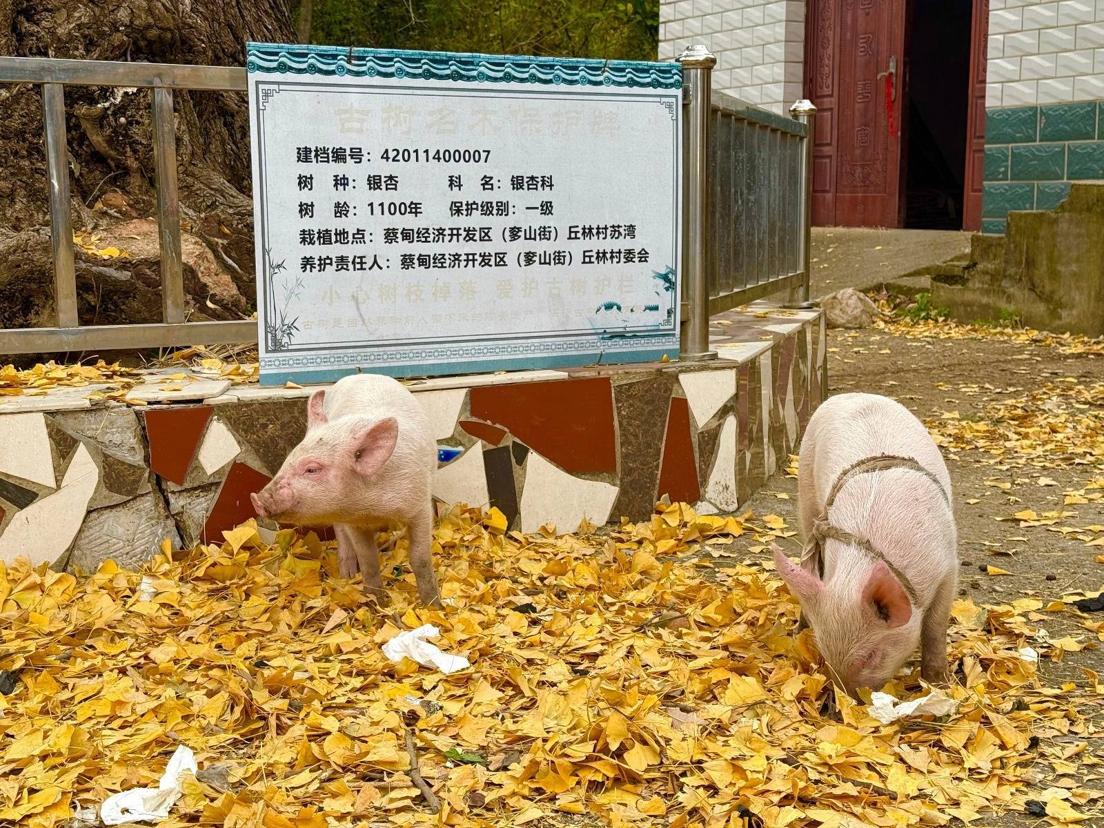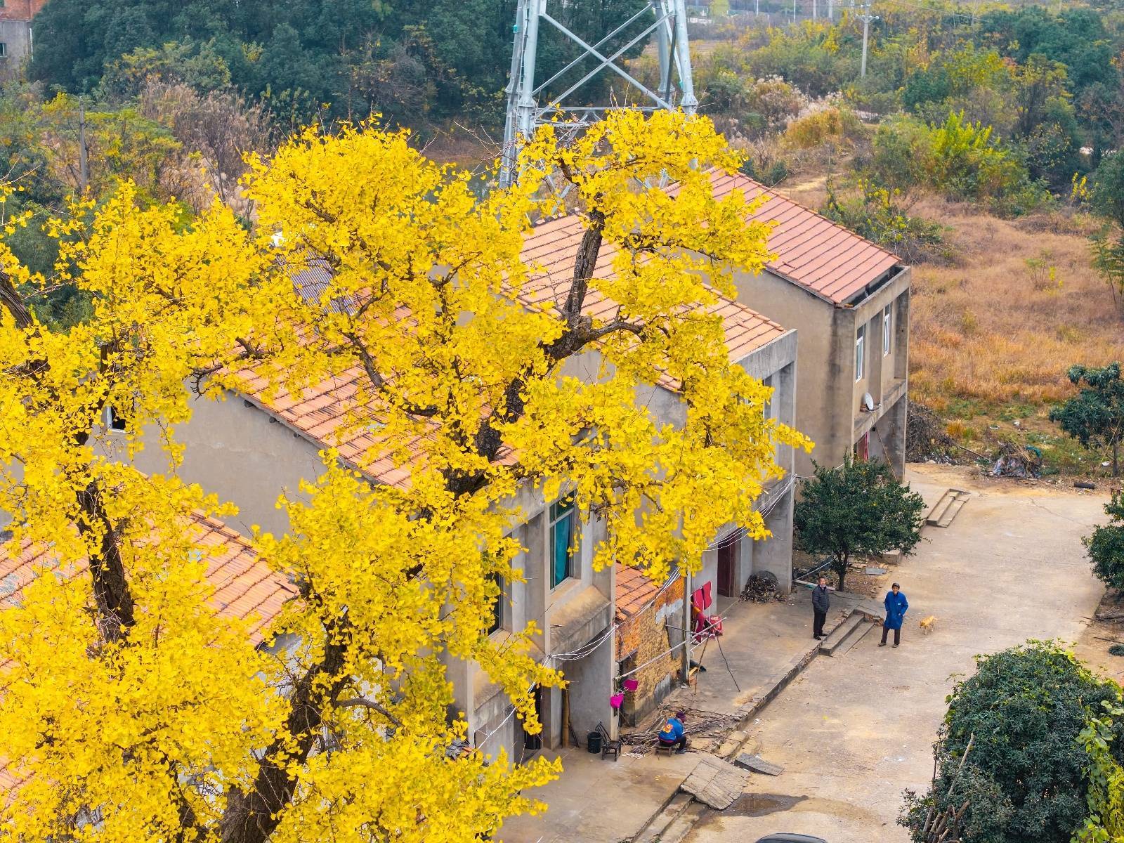 12月4日,记者寻访到这棵古树。只见它身披“金甲”,满树鎏金,落叶在地上铺成一片金黄。偶有村民家的小狗和小猪在树下经过,更添几分乡间野趣。
