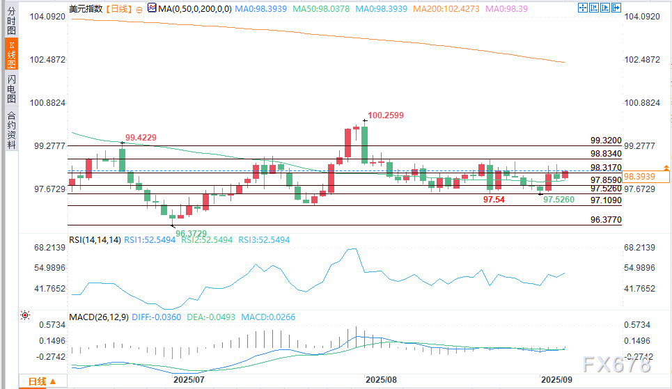 技术面展望:美元指数陷入窄幅震荡,关注98.370关键点位目前美元指数仍处于98.834的阻力位与97.536的支撑位之间震荡。当前位于98.000的50日均线正发挥短期支撑作用。若能突破98.370这一关键点位,将显示美元指数的强势信号。若收盘价高于该水平,可能产生足够动能测试98.635和98.834的阻力位。若50日均线支撑失效,则需关注美元指数向斐波那契关键点位97.859的走势,更深层次支撑位为近期低点97.536。
